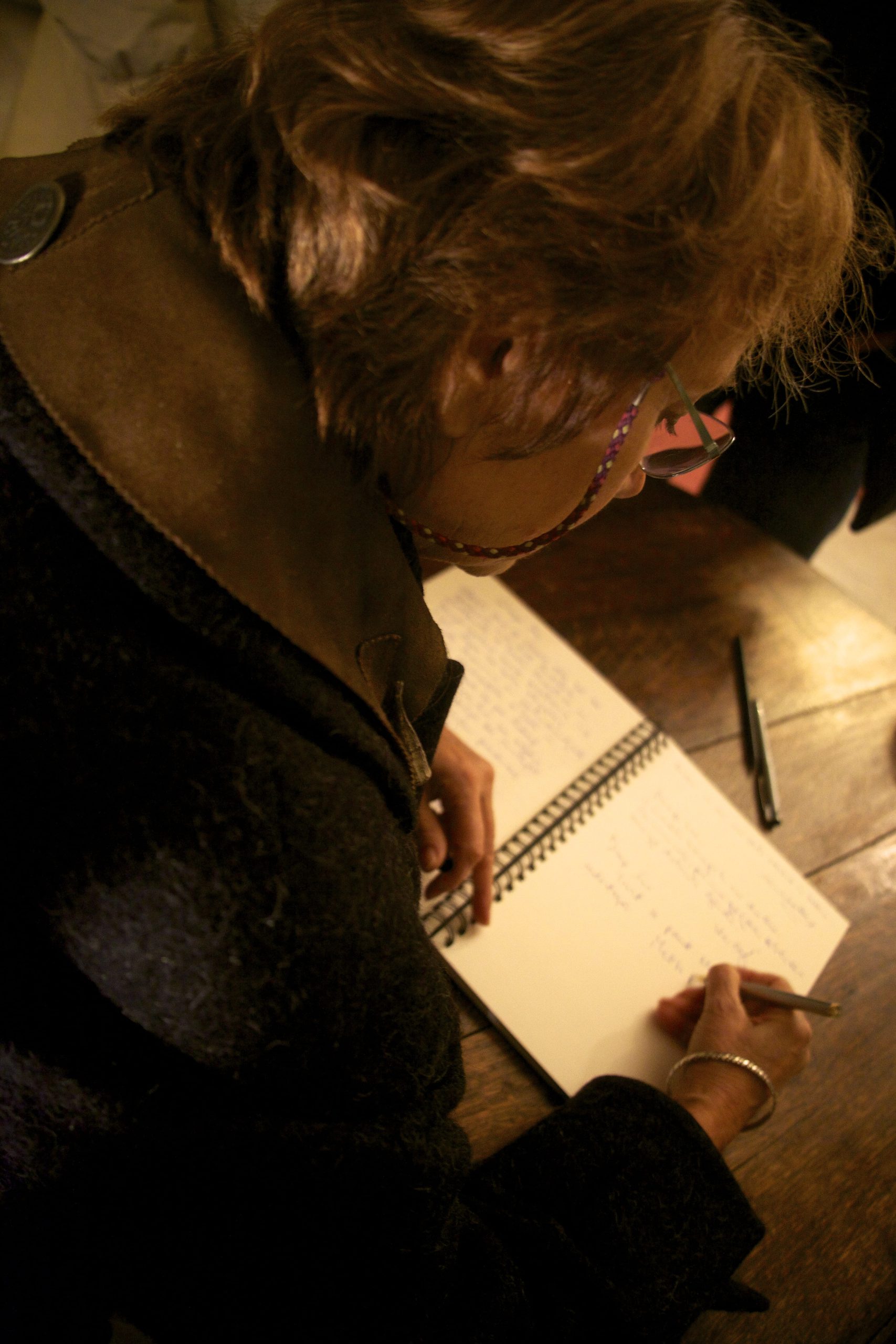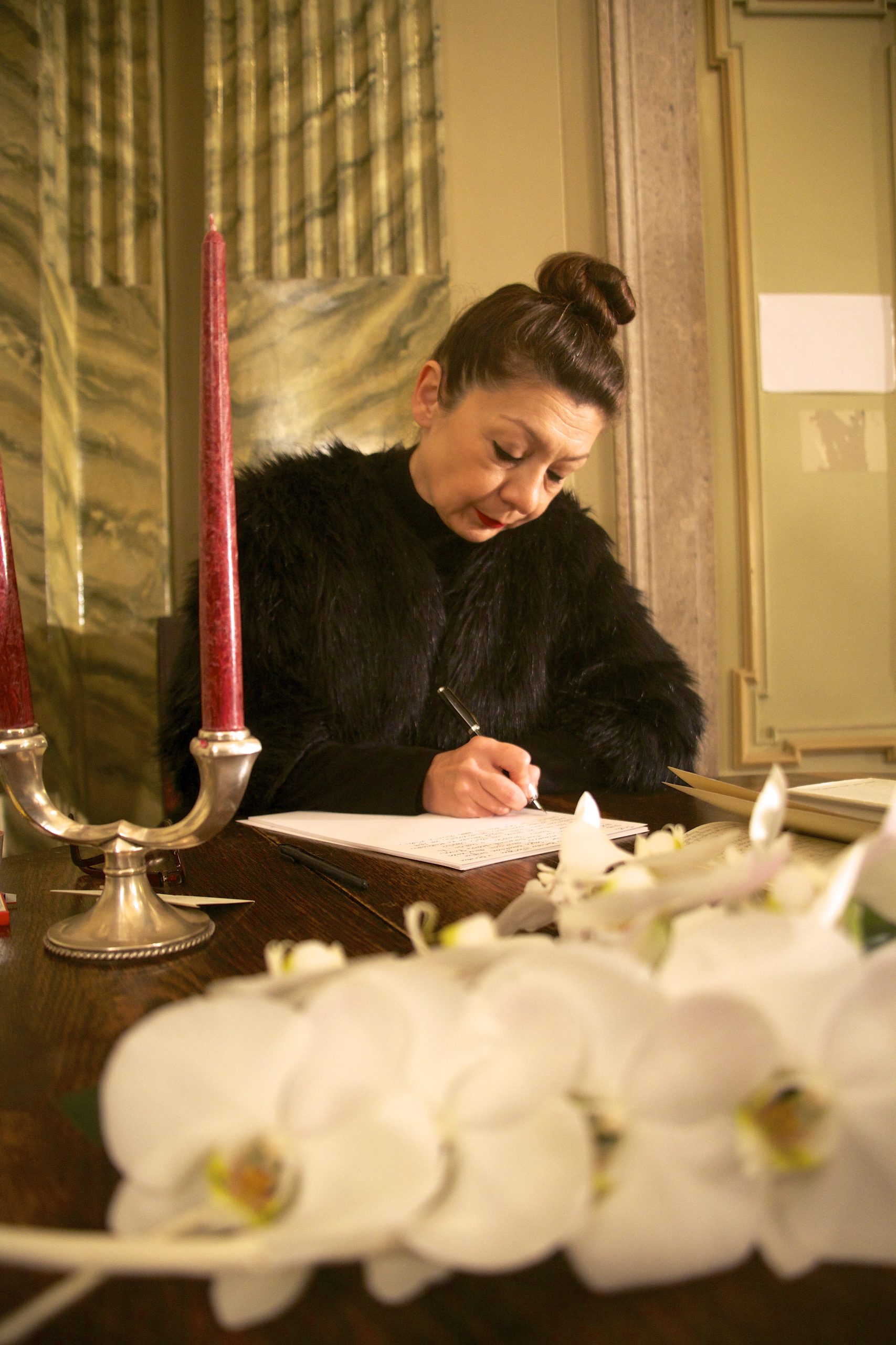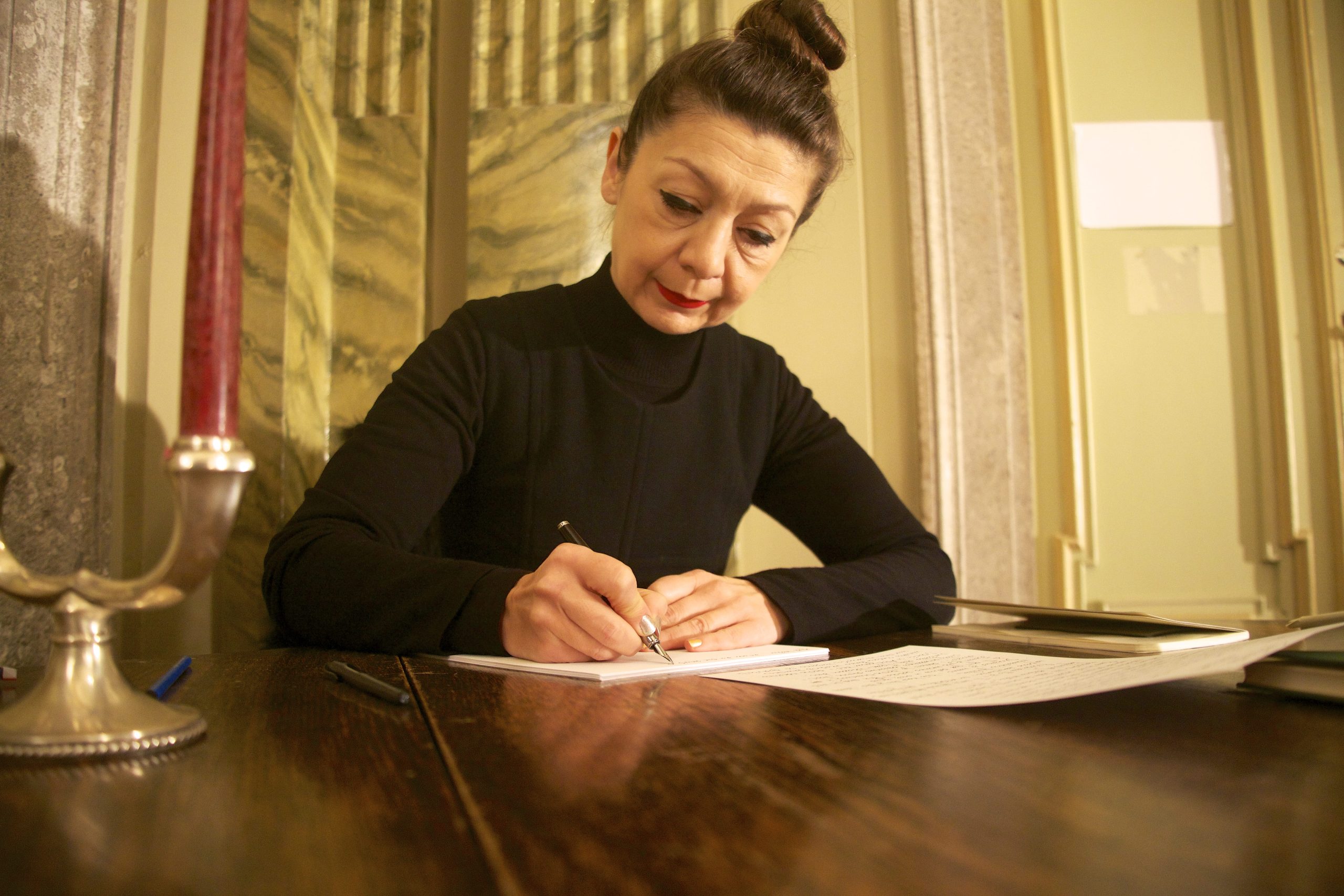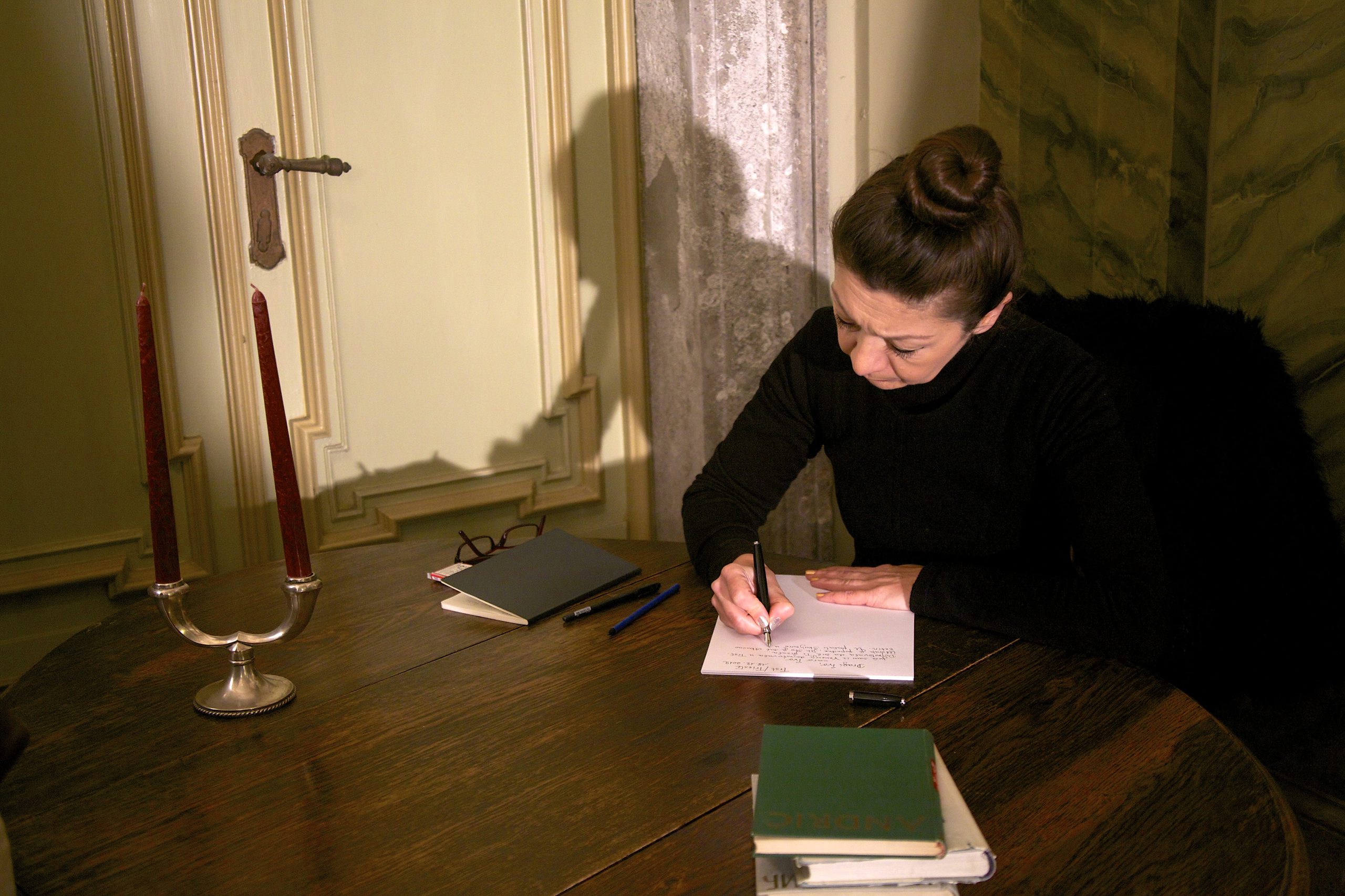 L’artista, seduta ad uno scrittoio d’epoca, intesserà con lo scrittore un dialogo in forma di lettera.