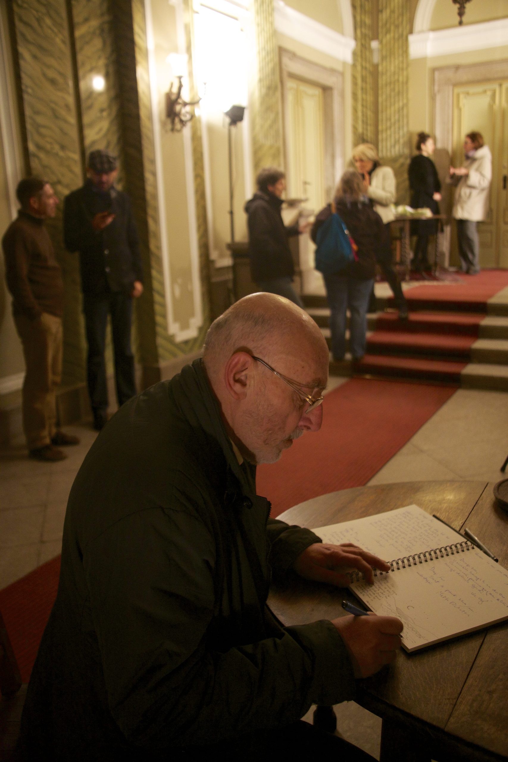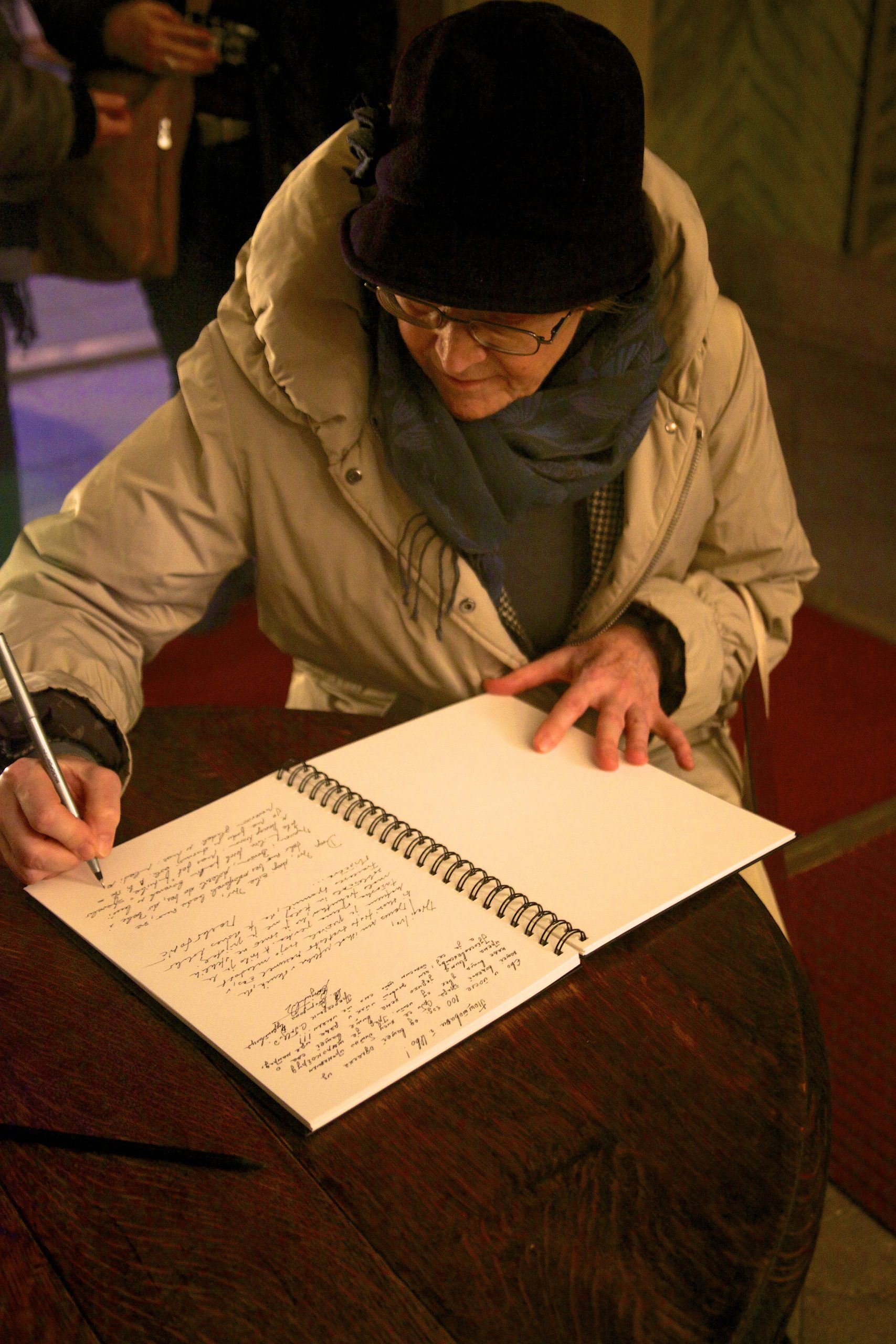 Da una parte il tavolo dov’è seduta Snežana Golubović, dall’altra, un altro tavolo, uguale al suo, a disposizione dei passanti, degli scrittori, degli artisti, dei vecchi e dei giovani che desiderano dedicare qualche pensiero all’illustre concittadino di una volta.