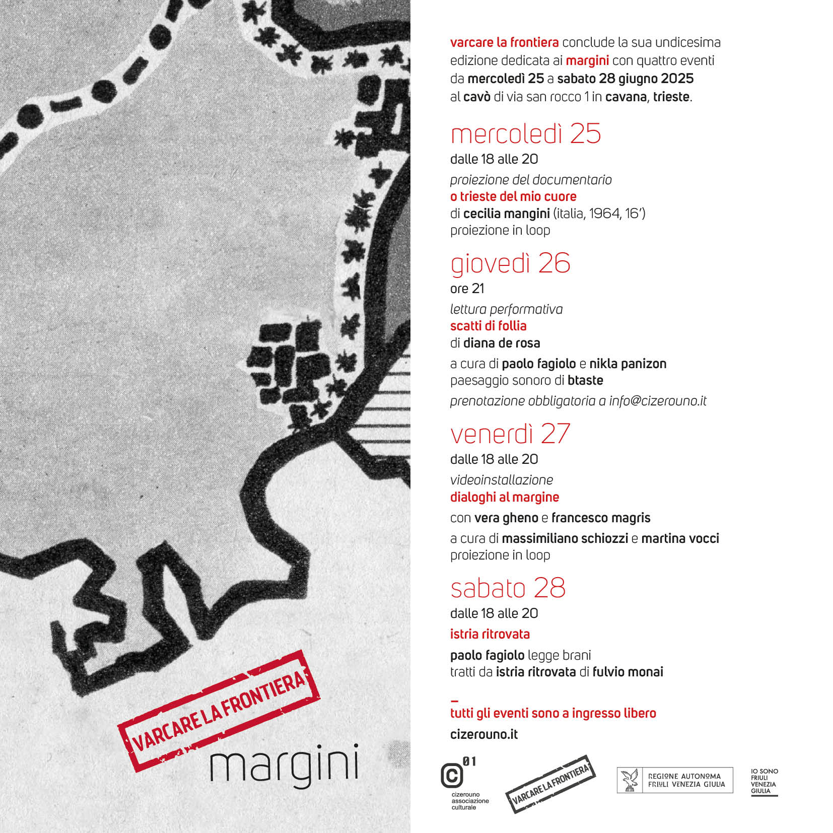 I “margini” saranno protagonisti in documentari d’inchiesta d’epoca realizzati tra Trieste, Gorizia e Monfalcone, in riflessioni linguistiche, videoinstallazioni e una serie di produzioni originali offerte al pubblico come momenti di incontro e riflessioni condivise.