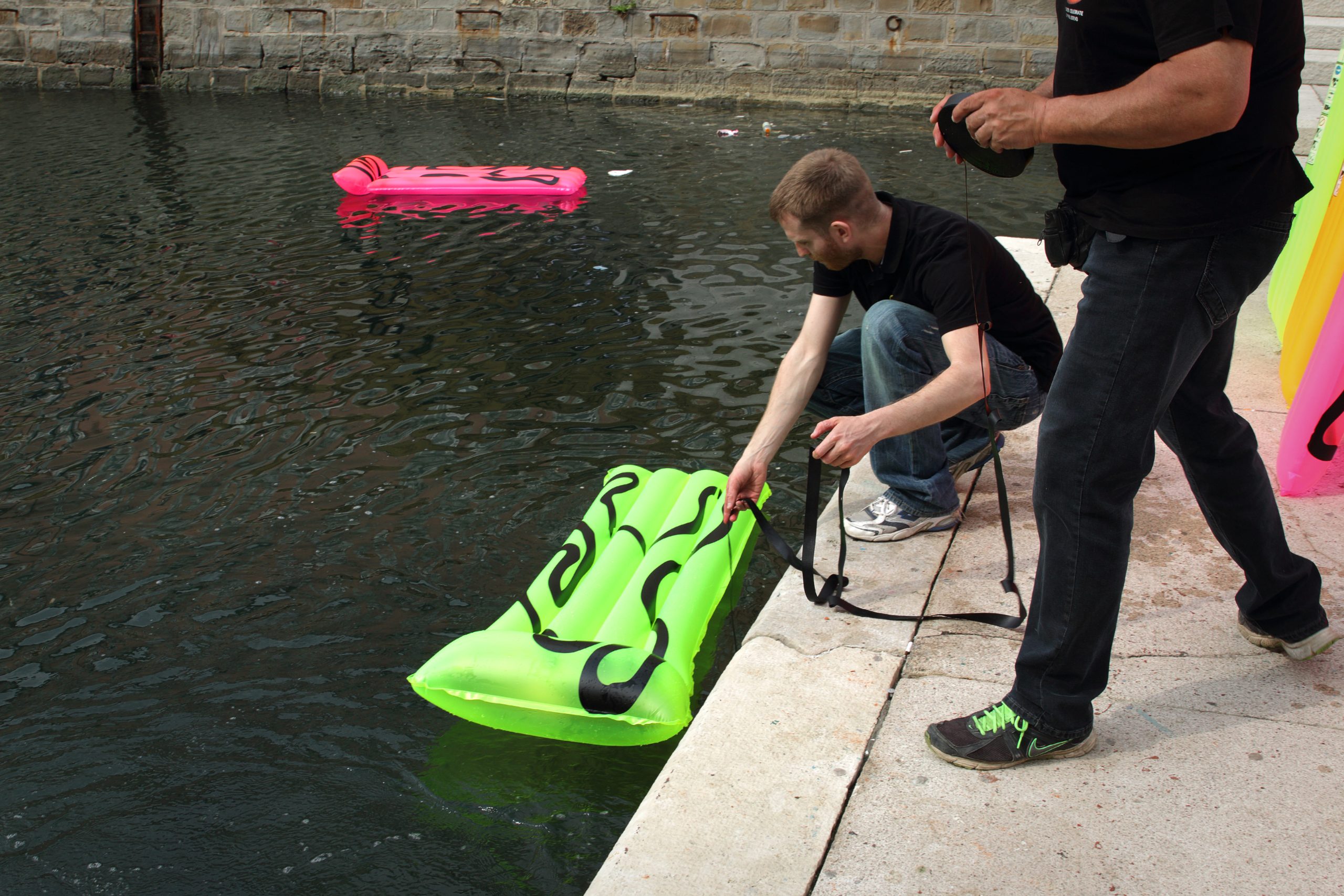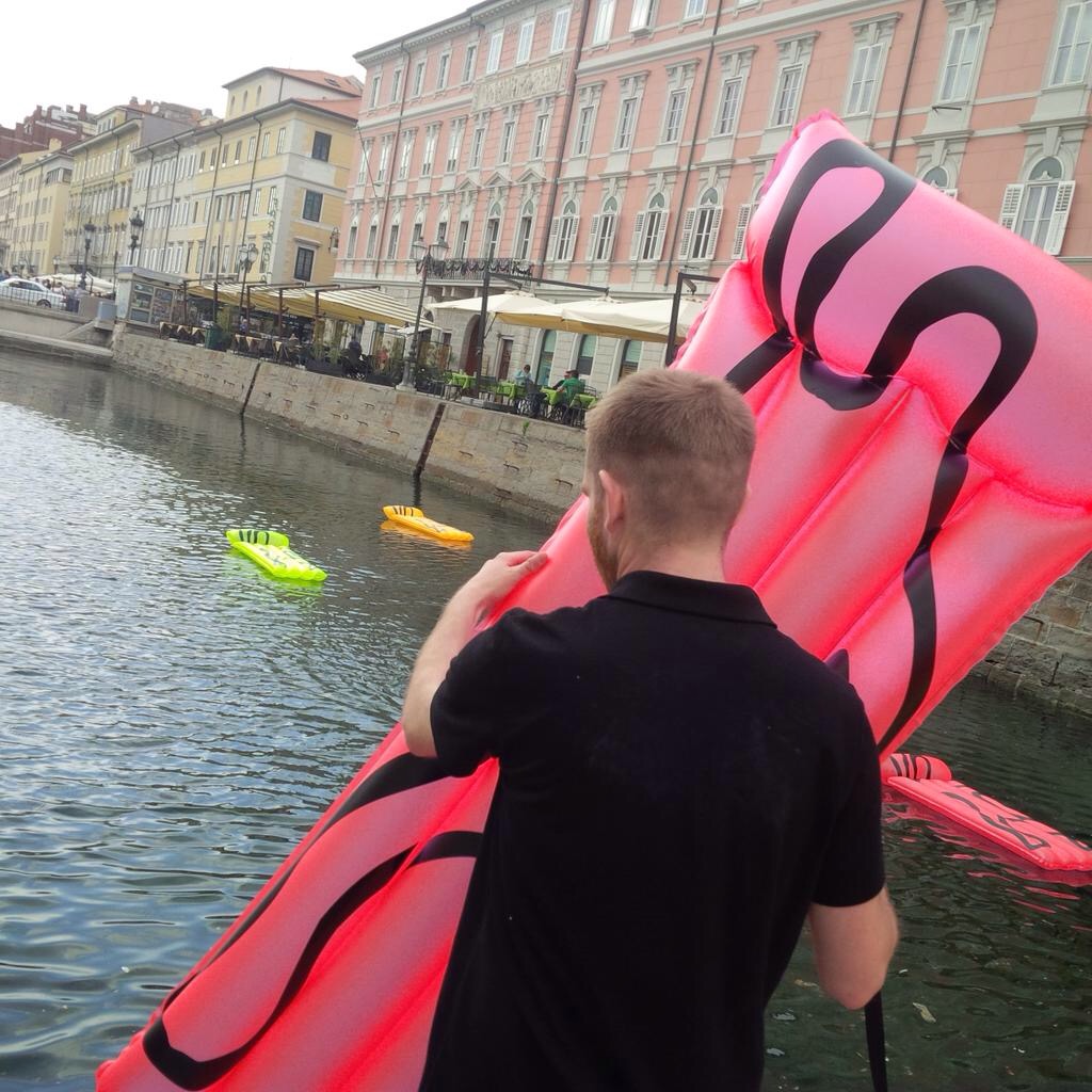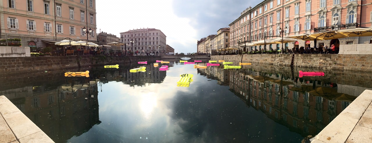 Nel punto più a nord del Mare Mediterraneo, in un città che ha nel rapporto con il mare e con l’estate uno dei suoi tratti peculiari e identitari, il materassino gonfiabile dai colori accesi delle vacanze, dell’estate e della spensieratezza viene segnato da un profilo nero.