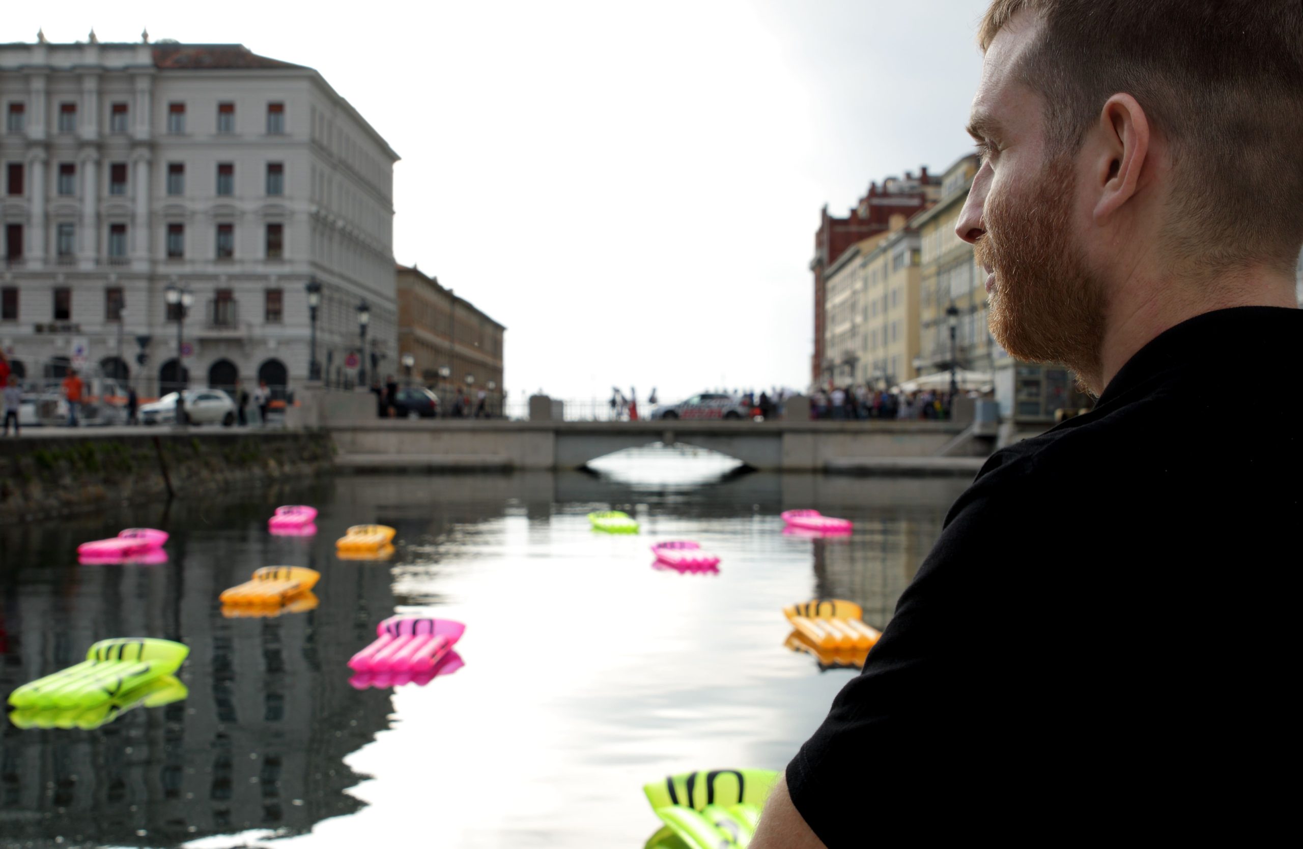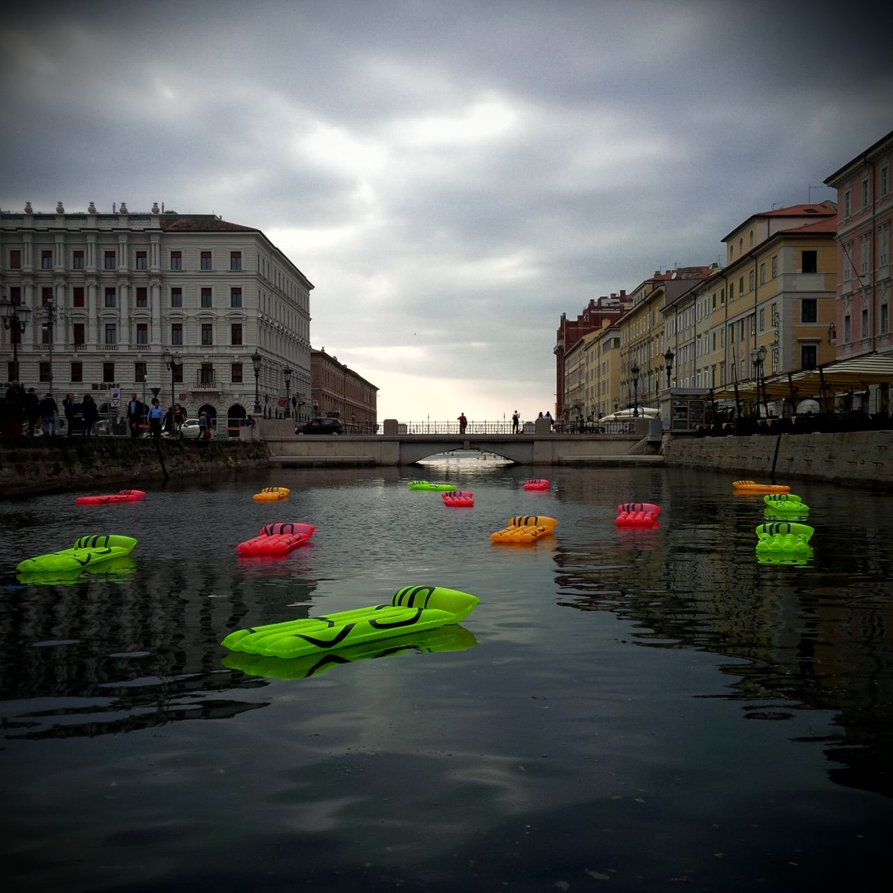 L’installazione – pensata e progettata dall’artista per lo specchio d’acqua del canale di Ponterosso – affronta il tema del mare come frontiera da attraversare e come comun denominatore delle diverse città e tratti di costa da dove ogni estate migliaia di immigrati arrivano in Italia.
