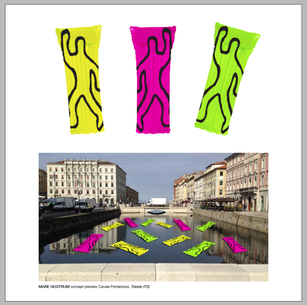 Ecco dunque che l’installazione Mare Nostrum, ideata da Emmanuele Panzarini, sul canale di Ponterosso a Trieste, entra in modo preponderante nella discussione pubblica e politica. L’intervento, realizzato nell’ambito della rassegna Varcare la frontiera, affronta il tema del mare come frontiera da varcare e come comun denominatore delle diverse città e tratti di costa da dove migliaia di immigrati sbarcano in Italia.