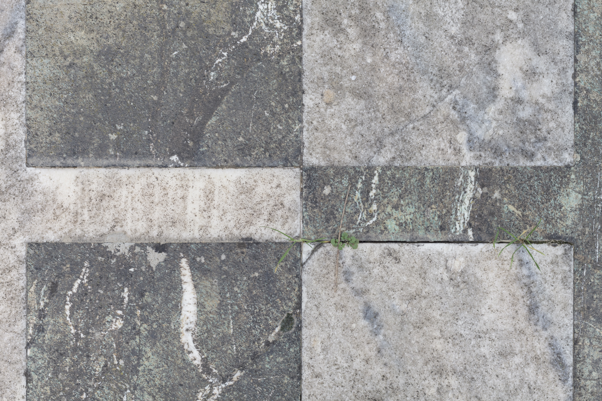 Incassate nel piano una accanto all’altra, due croci latine, a misura d’uomo. Quella rosa è incassata di poco nella lastra verde, quella verde sta dentro il fondo rosa.