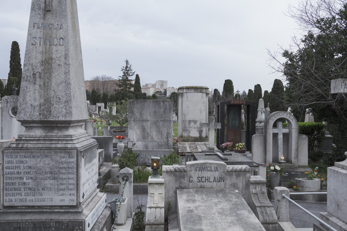 Vien da pensare che un doppio valore semantico sia depositato tanto in quelle croci quanto in quella lastra di pietra, che ricorda le sepolture del poco lontano cimitero ebraico, e che lo stesso atto che riunisce sotto un unico tetto, a Trieste, una madre ebrea che vi si era spenta, un padre deportato ed un intellettuale ramingo, agnostico in fatto di religione, sia in fondo l’espressione vera di un profondo bisogno umano di ritrovarsi.